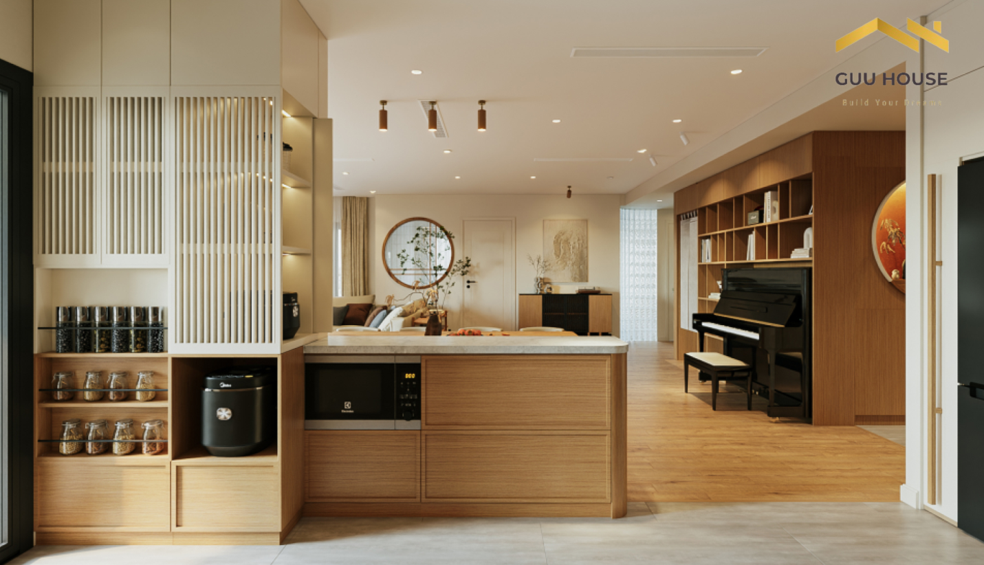 Guu House đã kiến tạo không gian căn hộ với sự tinh tế trong từng chi tiết, mang lại sự ấm cúng, thư thái nhưng vẫn đầy đủ tiện nghi. Phong cách Japandi được thể hiện qua sự kết hợp giữa vật liệu tự nhiên và bảng màu trung tính nhẹ nhàng, giúp căn hộ trở thành nơi thư giãn lý tưởng giữa nhịp sống hiện đại.